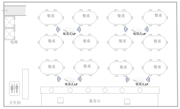 餐廳相對空曠,阻隔物較少,可根據(jù)餐廳規(guī)模及吸頂式AP覆蓋范圍酌情部署,布點點位均勻分布,如下圖所示: