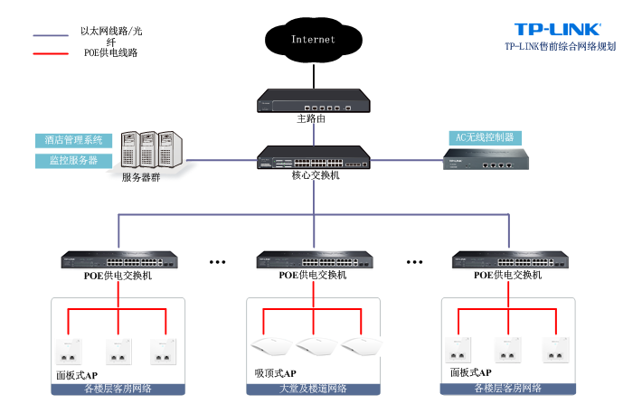 方案使用TP-LINK商用無線產(chǎn)品實現(xiàn)覆蓋,采用無線控制器AC和FIT AP的方式進行部署。有如下特點: