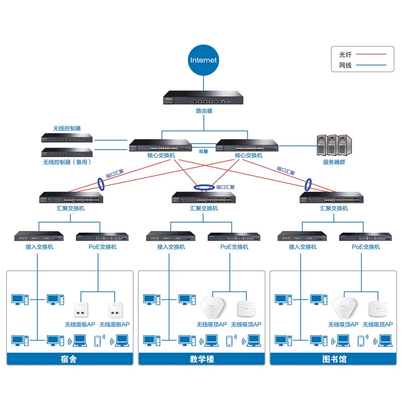 TP-LINK提供無(wú)線吸頂式、面板式、桌面式、室外等各種AP,可實(shí)現(xiàn)教學(xué)區(qū)、生活區(qū)、圖書(shū)館等所有區(qū)域的無(wú)線全覆蓋。