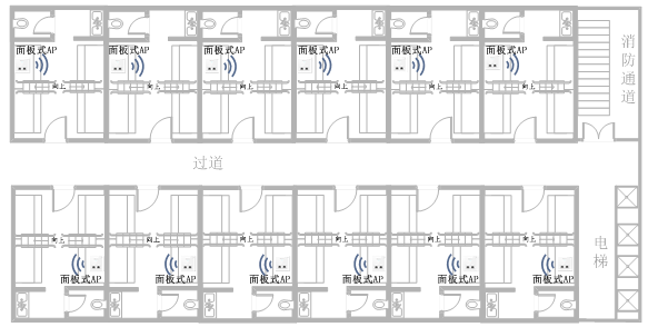宿舍接入環(huán)境密集、墻壁阻隔較多,對(duì)無(wú)線信號(hào)的衰減相對(duì)較大,面板式AP推薦每個(gè)房間部署一臺(tái)。如下圖所示: