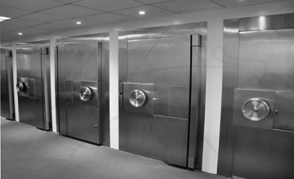 2、厚度為14mm鋼板+U型鋼制骨架(壁厚2.0mm)+1.2mm鋼板,鉸鏈側(cè)有2個(gè)明鉸鏈和六個(gè)固定栓,固定栓直徑為35mm,高30mm,門(mén)扇開(kāi)啟則有六個(gè)活動(dòng)鎖栓,活動(dòng)鎖栓的直徑為35mm,伸出長(zhǎng)度為30mm。門(mén)扇上安裝一把S&G6730型機(jī)械密碼鎖和一把LG2270型鑰匙鎖,鎖具安裝部位有5.0mm加強(qiáng)鋼板進(jìn)行防護(hù)。