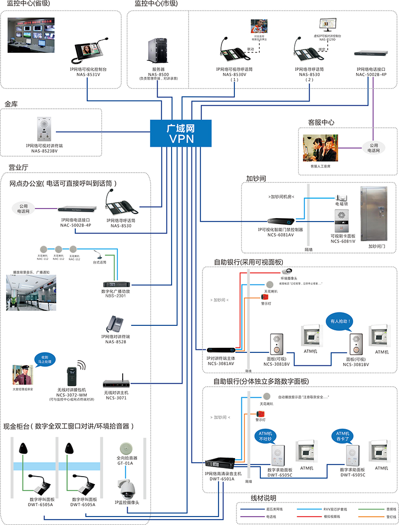 世邦銀行IP網(wǎng)絡(luò)對講通信系統(tǒng)采用領(lǐng)先的IPAudio?技術(shù),將音頻信號以數(shù)據(jù)包形式在局域網(wǎng)和廣域網(wǎng)上進(jìn)行傳送,是一套純數(shù)字傳輸?shù)拿馓釋χv系統(tǒng)。它解決了傳統(tǒng)對講系統(tǒng)存在的傳輸距離有限、易受干擾等問題。該系統(tǒng)結(jié)構(gòu)清晰,只需將終端接入計算機(jī)網(wǎng)絡(luò)即可構(gòu)成功能強(qiáng)大的數(shù)字化通訊系統(tǒng),每個接入點(diǎn)無需單獨(dú)布線,實現(xiàn)計算機(jī)網(wǎng)絡(luò)、數(shù)字視頻監(jiān)控、內(nèi)部通信的多網(wǎng)合一。世邦通過對銀行安防需求的深入理解,首創(chuàng)了專為自助銀行設(shè)計的分體式對講終端,以及一系列的人性化功能,使得本系統(tǒng)不局限于簡單的語音對講,而是面向銀行音頻應(yīng)用的整體解決方案。