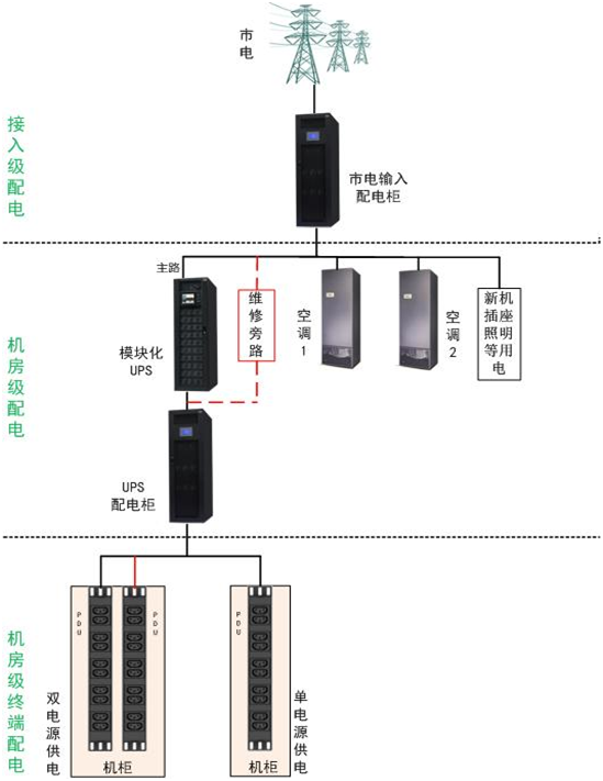 按中小型數(shù)據(jù)中心業(yè)務(wù)性質(zhì),可選用C級(jí)(基本級(jí))供配電系統(tǒng),滿足中小型數(shù)據(jù)中心IT設(shè)備可靠性用電要求。采用單路市電電源為數(shù)據(jù)中心機(jī)房UPS(不間斷供電電源)、機(jī)房空調(diào)、新風(fēng)、照明、維修插座等設(shè)備供電。市電電源正常運(yùn)行情況下,保證機(jī)房設(shè)備運(yùn)行不中斷。