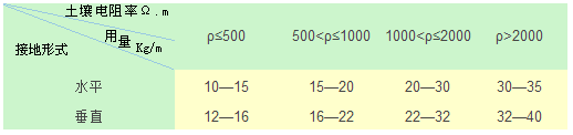 降阻劑的經(jīng)濟用量應視不同的土壤而定,在接地體上的敷設(shè)厚度應在5—15CM之間,為方便計算,推薦用量如下表: