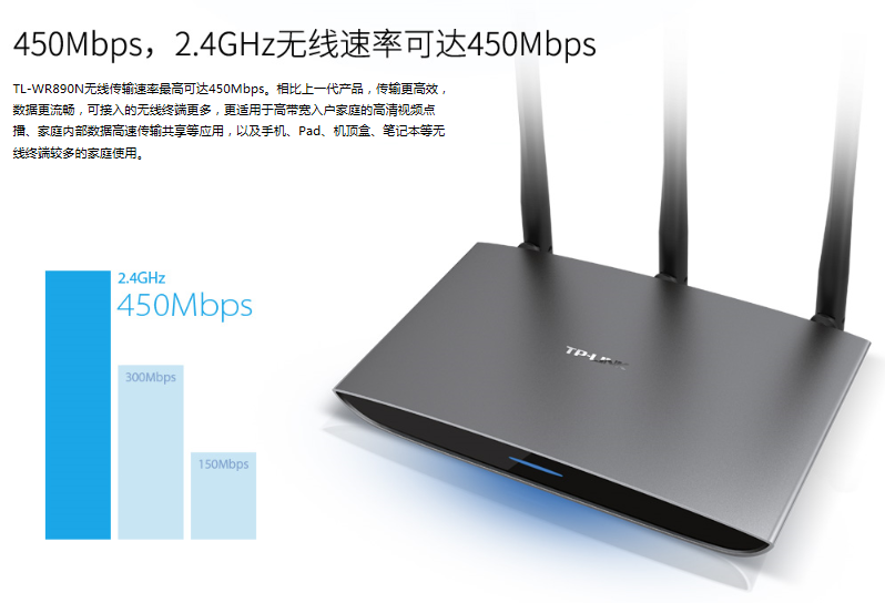 TL-WR890N無線傳輸速率最高可達450Mbps。相比上一代產品,傳輸更高效,數(shù)據(jù)更流暢,可接入的無線終端更多,更適用于高帶寬入戶家庭的高清視頻點播、家庭內部數(shù)據(jù)高速傳輸共享等應用,以及手機、Pad、機頂盒、筆記本等無線終端較多的家庭使用。