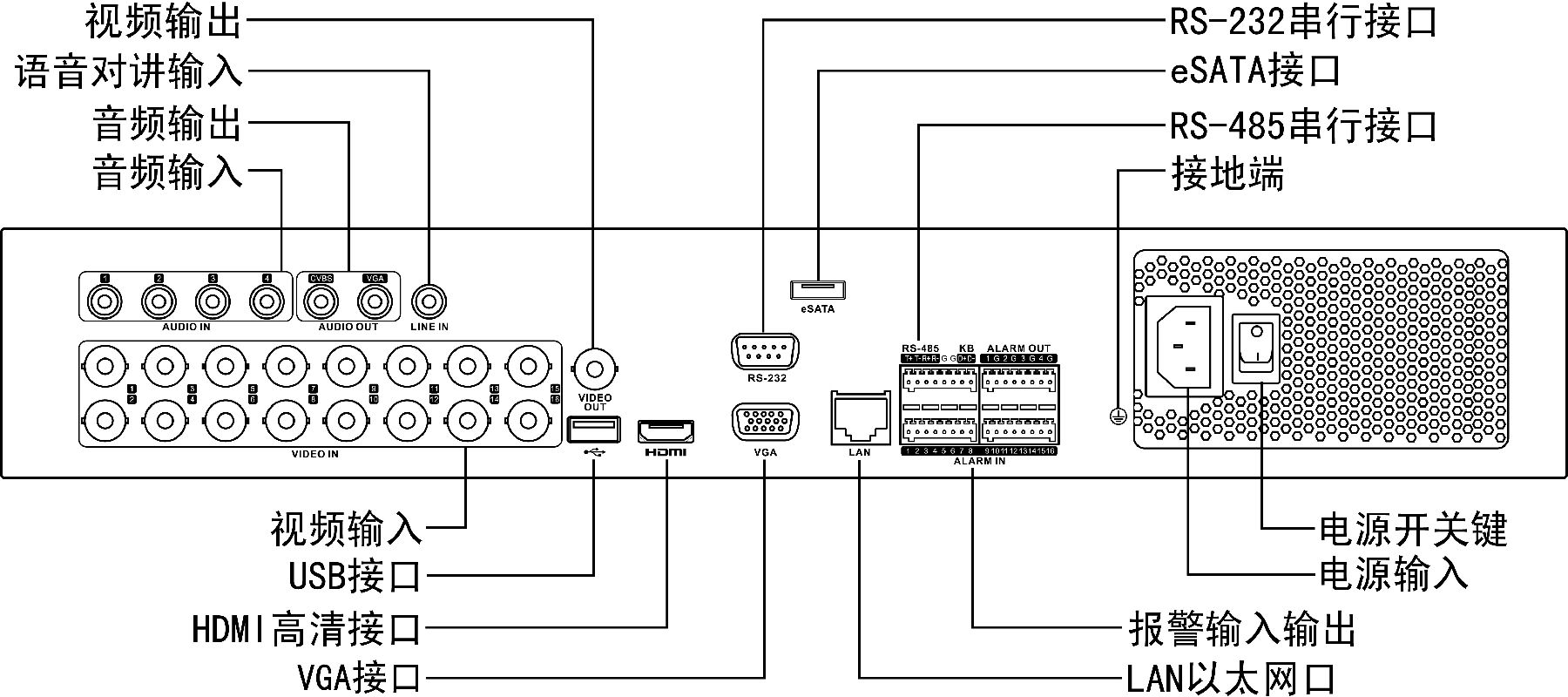注:DS-7908HQH-F4/N與DS-7916HQH-F4/N后面板類似,具體請(qǐng)以實(shí)物為準(zhǔn)。